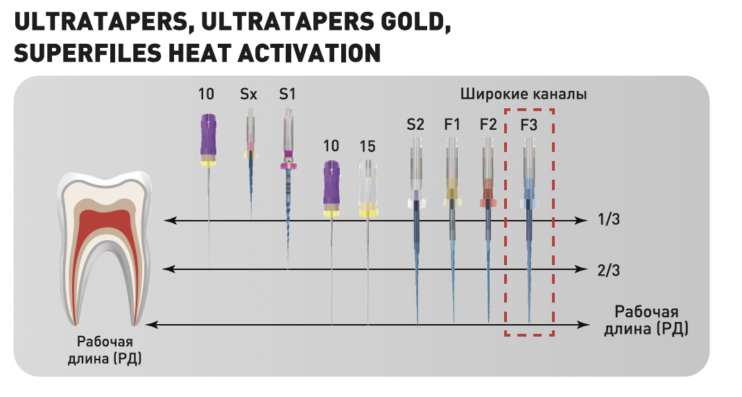- Изменяющийся угол спирали и шаг - предотвращают заклинивание в корневом канале.