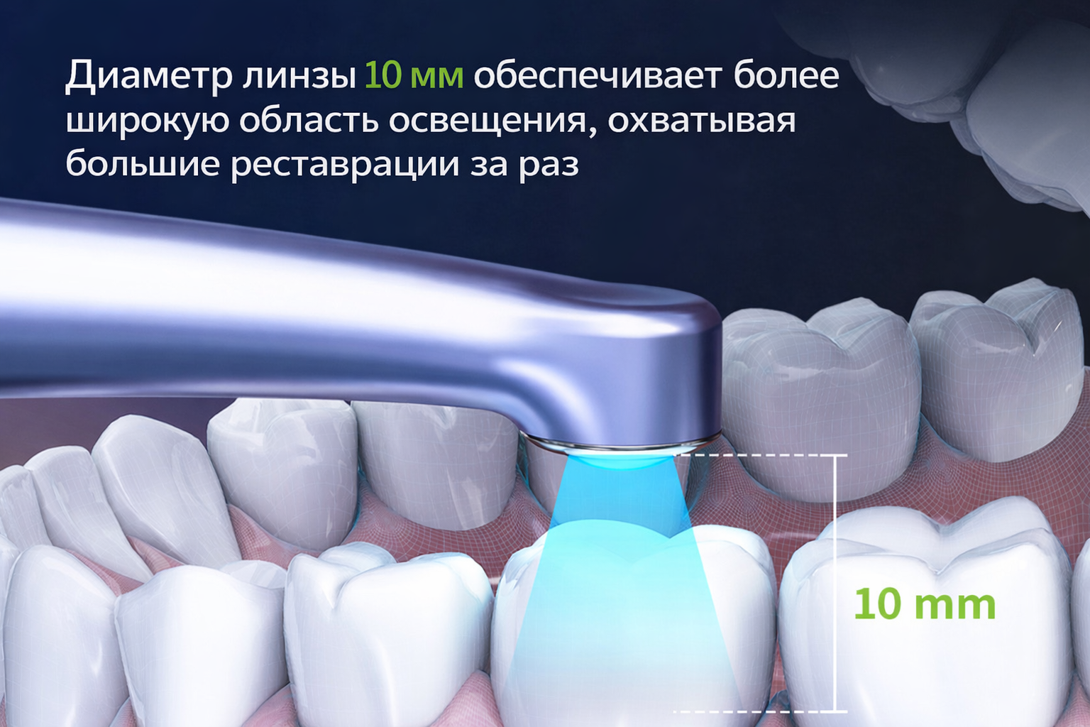 - Специальная линза излучает колоннообразный коллимированный луч, обеспечивая качественную и однородную полимеризацию на глубину до 3,5 мм.