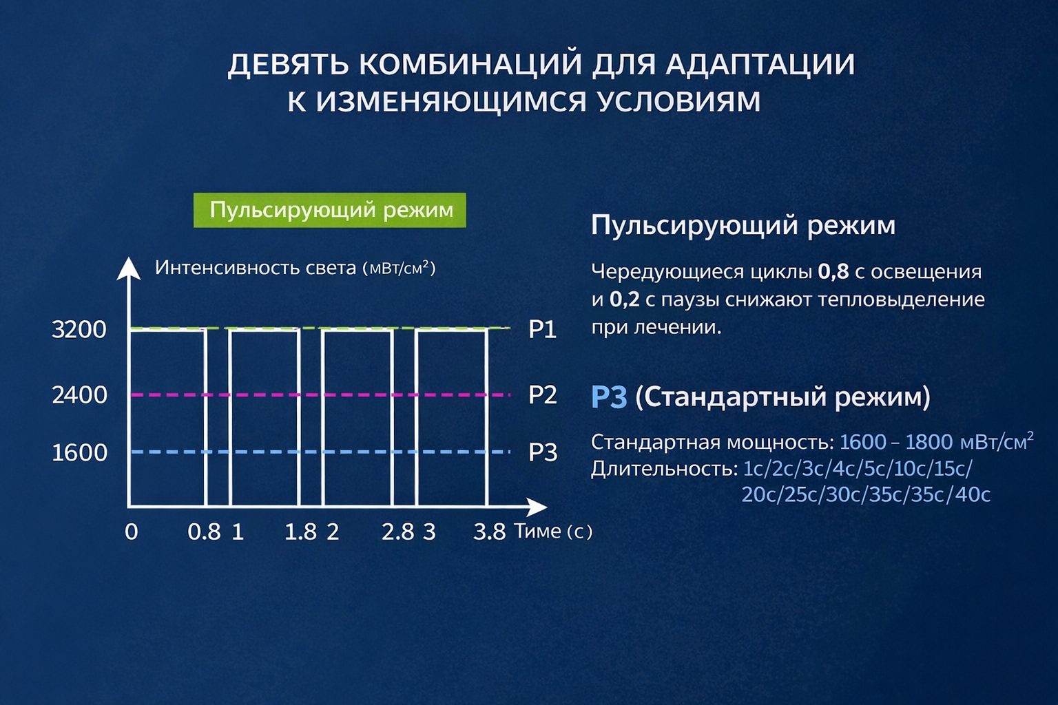 VRN Vafu Black имеет три режима работы – постоянный, нарастающий, импульсный, а также три режима мощности – 3200, 2400 и 1600 мВт/см2.
