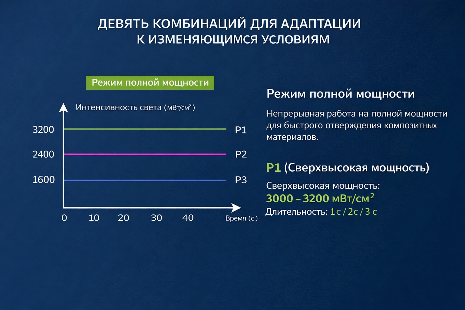 - Высокая мощность светодиода позволяет добиться невероятно быстрой полимеризации – 2 мм композита отверждаются всего за одну секунду.