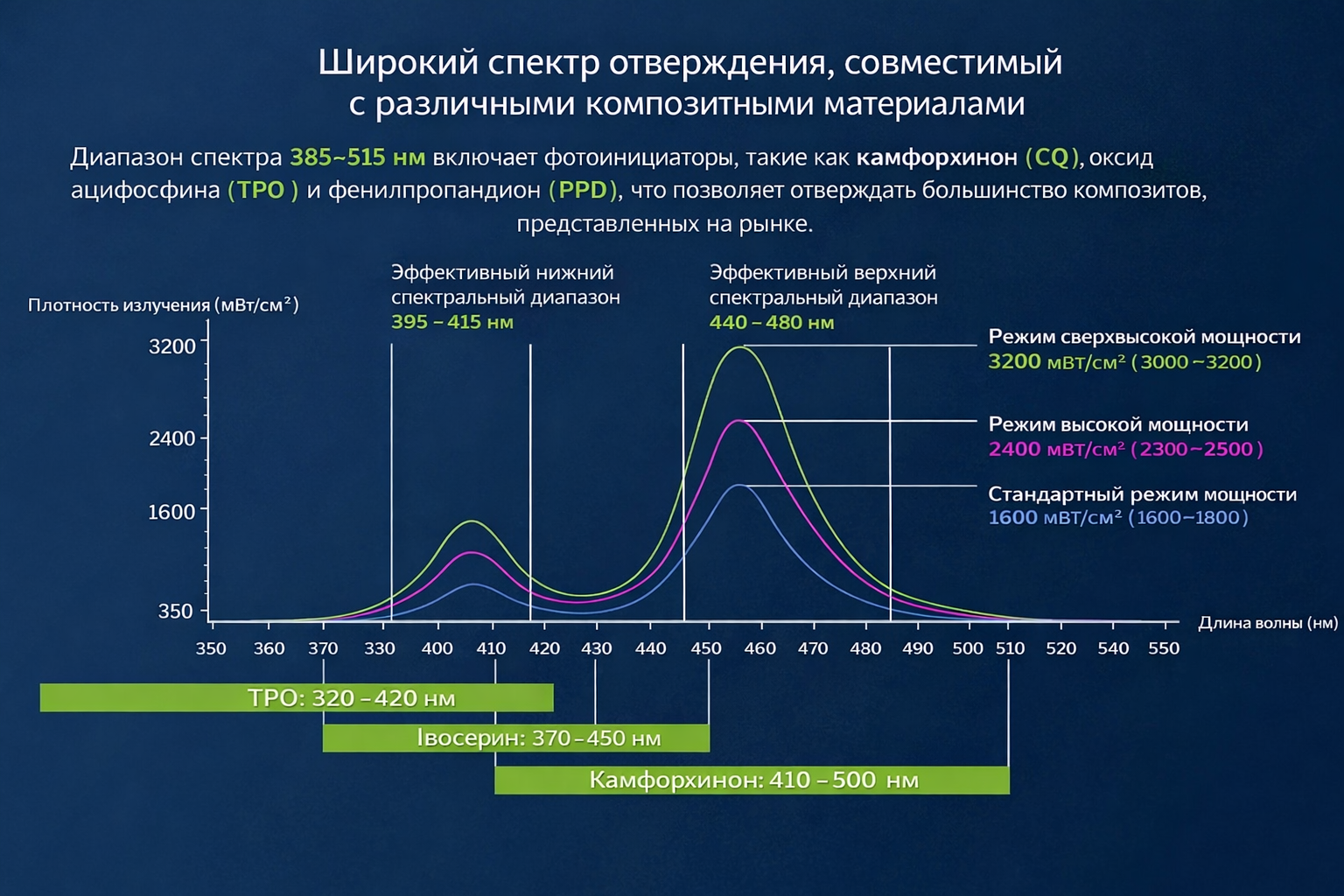Режимы мощности полимеризации 3 уровня 3 уровня 3 уровня Режимы работы 3 (полный, прогрессивный, пауза) 1 3 (полный, прогрессивный, пауза) Возможность беспроводной подзарядки Есть, соответствует протоколу WPC V1.1 Нет, есть подставка для зарядки Есть Длина волны 385-515 нм 395-480 нм 385-515 нм Диапазон мощности 1600-3200 мВт/см2 1000-3200 мВт/см2 600-2300 мВт/см2 Технические характеристики